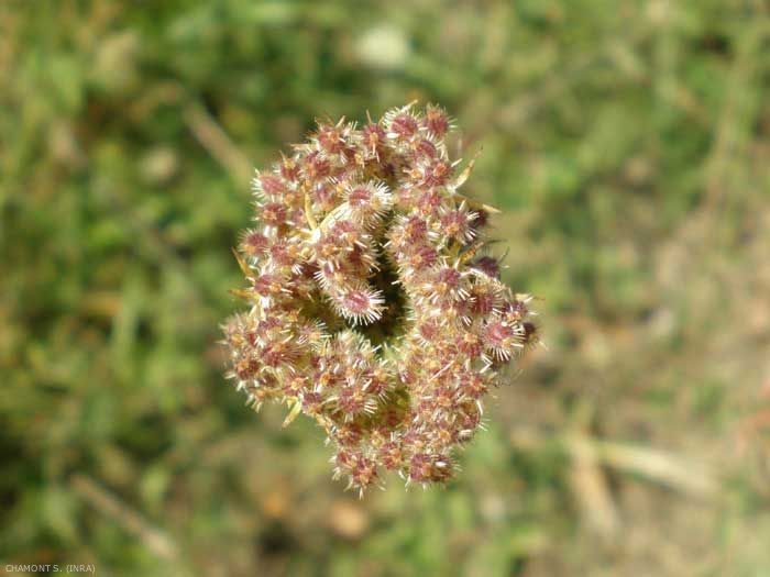 Fruits : akènes elliptiques, épineux. Carpophore persistant sur l'inflorescence après la chute du fruit.