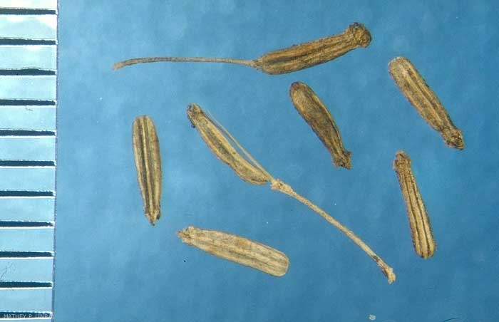 Fruits : akènes allongés, étroits, 3 à 4 mm de long, de couleur jaune à brunâtre. Carpophore persistant sur l'inflorescence après la chute du fruit.