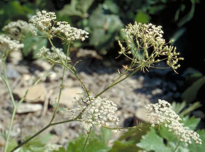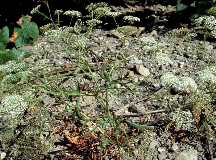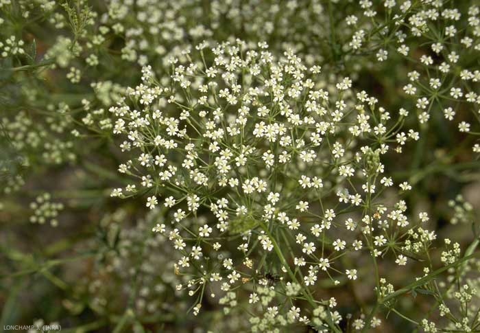 Fleurs blanches et petites (moins de 1 mm) en petites ombelles, serrées, à 12 ou 15 rayons. Involucre et involucelle à 4 à 8 bractées linéaires ou en alêne