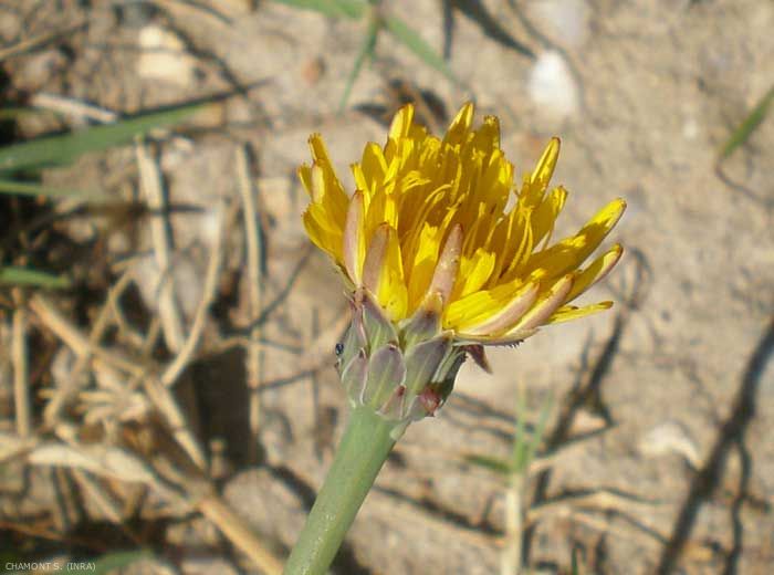 Fleurs jaunes en capitule. Involucre formé de bractées à bords membraneux, sans poils (uniquement des poils raides sur leur nervure médiane). Fleurs se prolongeant par une ligule à 5 dents