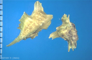 Forme : semence grossière, anguleuse, dissymétrique à bec à son extrémité et à apophyses "en nageoires épineuses" disposées latéralement. Semences triangulaires, aplaties, brunes (2 à 3 mm)
