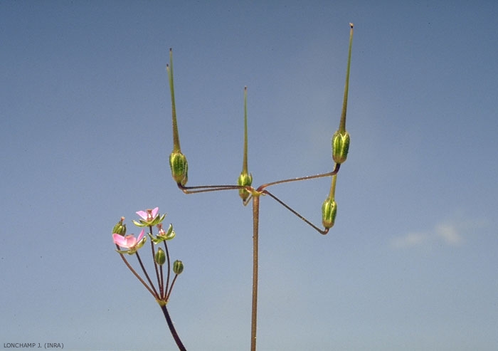 - syn. : bec-de-grue commun, petit bec-de-cigogne, petit géranium-ciguë, l'héritier cicutaire