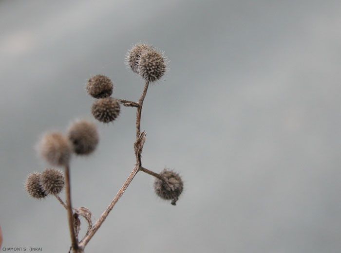 Fruits bruns et globuleux couverts de crochets de 2 à 3 mm de diamètre, groupés par 2.