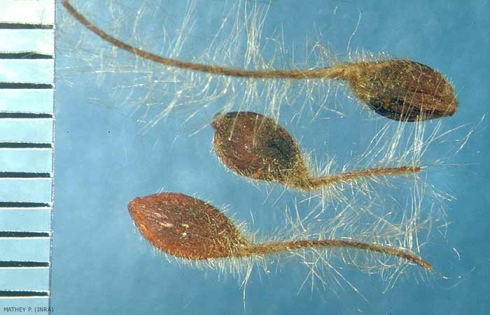 Forme : semence elliptique comprimée, pubescente, prolongée par un style plumeux atteignant 5 cm de long