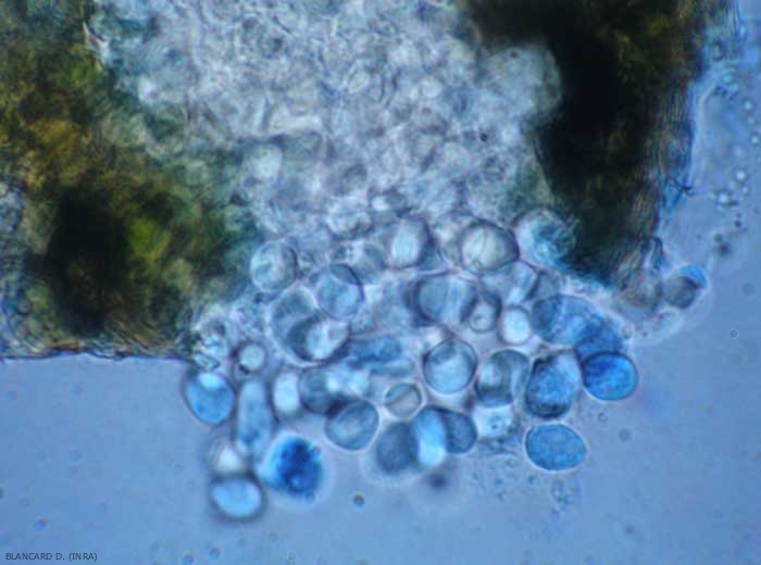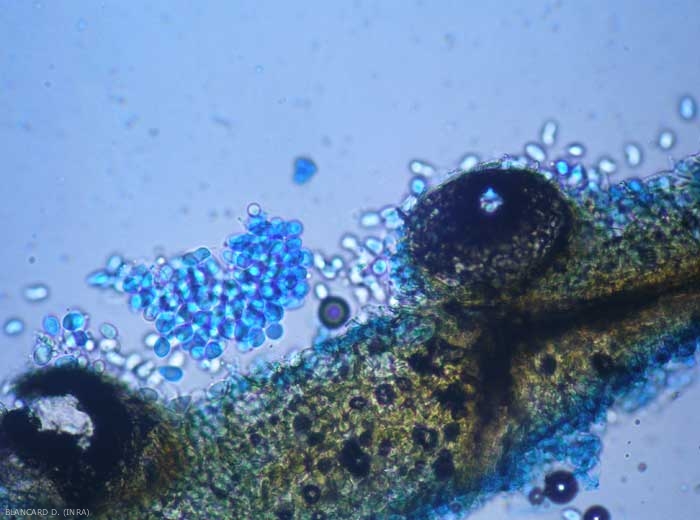 Les pycnides, fructifications de la forme imparfaite (Phyllosticta sphaeropsoidea, figure 1) de l'agent pathogène, sont sombres, ostiolées, globuleuses et enfouies dans un stroma sous épidermique.