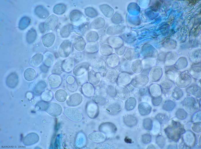 Les périthèces de 175 µm, renferment des asques qui contiennent 8 ascospores ellipsoïdes, hyalines et unicellulaires mesurant 7,5-10 x 5-6,5 µm ainsi que des paraphyses qui se résorbent à maturité.