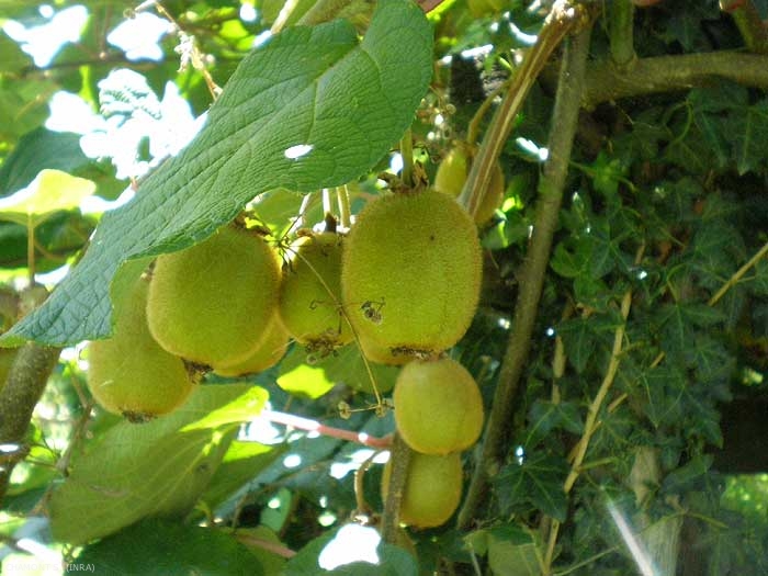 Le fruit (kiwi), est une grosse baie ovale, recouverte d'une pellicule brun-verdâtre très velue, à pulpe vert pâle avec de petits grain noirs, que l'on consomme frais et qui est très riche en vitamine C. La récolte est tardive (premières gelées). La maturation se fait après la récolte. Elle est accélérée par l'éthylène produite par pommes et bananes mûres. Dans de bonnes conditions, la conservation est possible jusqu'à l'été suivant.