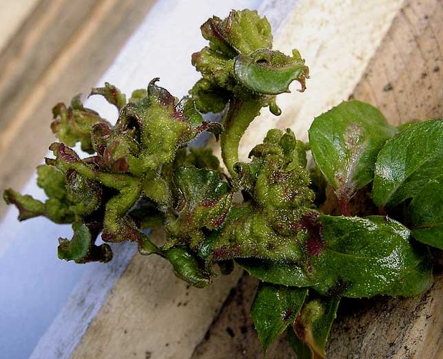 Les feuilles sont le premier organe atteint. Après le flétrissement des bourgeons terminaux, elles se couvrent d’un voile blanc similaire à de l’oïdium. Attaquées par l’acarien, ces feuilles commencent par rougir avant de se boursoufler, formant des galles vert pâle (Figure 1) qui deviennent rougeâtres (Figures 2 et 3) par la suite. Les fleurs sont progressivement touchées.
