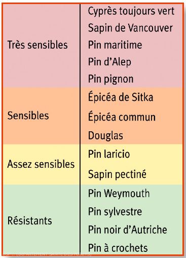 Ces gelées affectent les pousses, notamment la pousse terminale, d’un arbre dont les bourgeons viennent de débourrer et qui ne supportent alors pas les températures inférieures à - 4 °C. Elles entraînent des déformations, des pertes de production, et même la mort de l’arbre si elles se répètent. Certains résineux y sont particulièrement sensibles. On pourrait penser que les essences montagnardes, habituées au froid, y sont plus résistantes. Il n’en est rien, bien au contraire. Un plant ne débourre que lorsqu’il a « enregistré » pendant les mois qui précèdent, un certain nombre de jours où la température dépasse un seuil qu’Aussenac (1973) fixe à + 2 °C. Plus précisément, c’est la somme des températures dépassant ce seuil, qui conditionne le redémarrage. Cette somme permet de calculer un indice empirique qui est de 490 degrés-jour pour le sapin pectiné, 540 degrés-jour pour le douglas, 600 degrés-jour pour l’épicéa commun. Le sapin, demandant moins de « chaleur cumulée » que les autres, débourrera plus tôt et aura donc une saison de végétation plus longue. C’est un avantage en montagne où la belle saison est naturellement courte mais, installé en plaine où les limites des saisons sont moins tranchées et l’hiver plus doux, il va débourrer trop tôt. Il sera alors sensible aux gelées de printemps, qui peuvent survenir jusqu’en mai. Le réchauffement climatique, impliquant des hivers plus cléments, devrait entraîner un débourrement plus précoce. On a craint un moment que la sensibilité aux gelées tardives soit de ce fait augmentée. Il semblerait heureusement que non pour la majorité des essences car, en parallèle, la probabilité d’apparition d’une gelée sera diminuée.