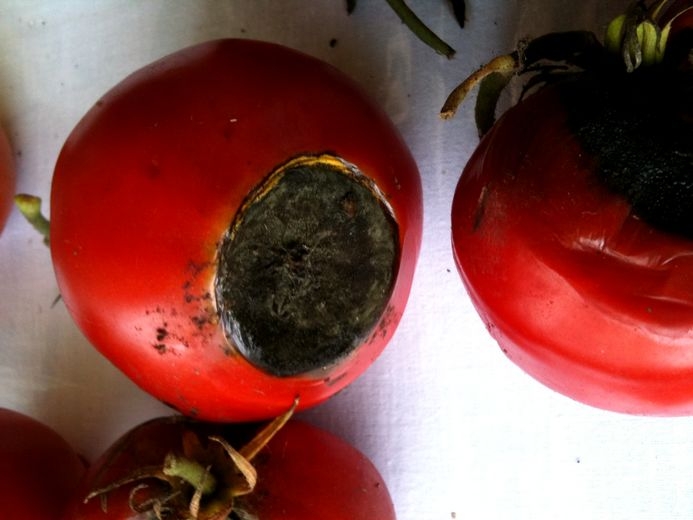 Sur fruits, la nécrose apicale (« cul noir ») est un symptôme lié à des irrégularités d’irrigation (figures 4 et 5). Dans ce cas, une tache apparait uniquement du côté opposé au calice, à l’emplacement de la cicatrice de l'implantation des pièces florales. Celle-ci est de consistance plutôt sèche, ce qui n’est pas le cas pour l’alternariose.