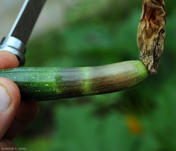 C. cucurbitarum provoque des pourritures sur les fleurs (figure 1) et par la suite sur les fruits (figure 2) des Cucurbitacées. Celles-ci sont souvent humides et située à l'extrémité des fruits. Les tissus affectés, humides et mous, prennent un aspect translucide et une teinte sombre (figures 3 et 4). Les fruits peuvent se liquéfier entièrement en quelques jours.