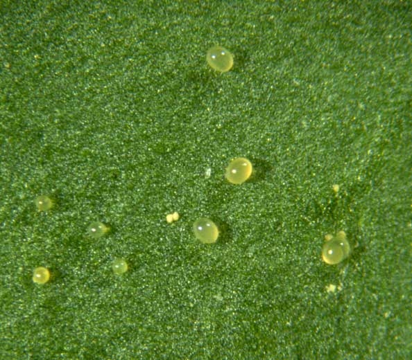 Les oeufs (1) (figure 3) sont pondus principalement sur la face inférieure des folioles. Ils sont ronds, minuscules (0,14 mm de diamètre), translucides dans un premier temps puis deviennent opaques, et finissent par jaunir à l'approche de l'éclosion. Les larves (2) (figure 4), qui ont 3 paires de pattes, sont d'abord très pâles, puis prennent une teinte verdâtre.