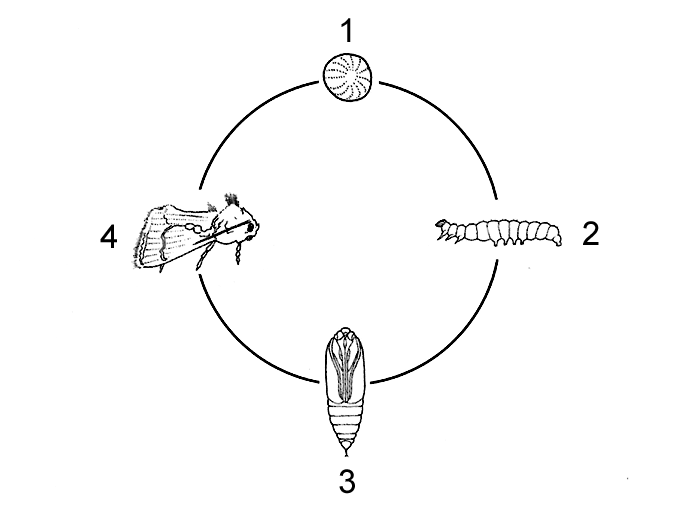 Les noctuelles, des Lépidoptères, passent par 4 stades de développement : oeuf, larve ou chenille, nymphe ou chrysalide, et papillon (figure 1).