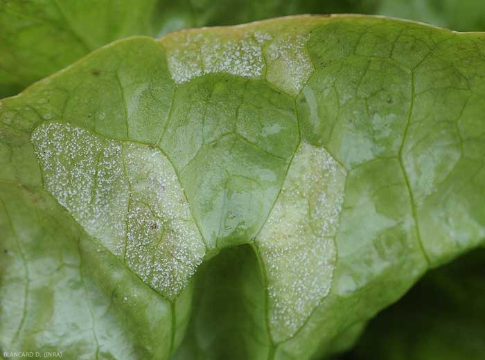 Le mildiou se dissémine aux autres feuilles et plantes grâce à des spores particulières (des sporanges), ceci à l'aide du vent ou de la pluie. Elles sont produites à la face inférieure des feuilles (figures 1 et 2), et ont besoin d’eau pour germer et atteindre les stomates présents sur le limbe.