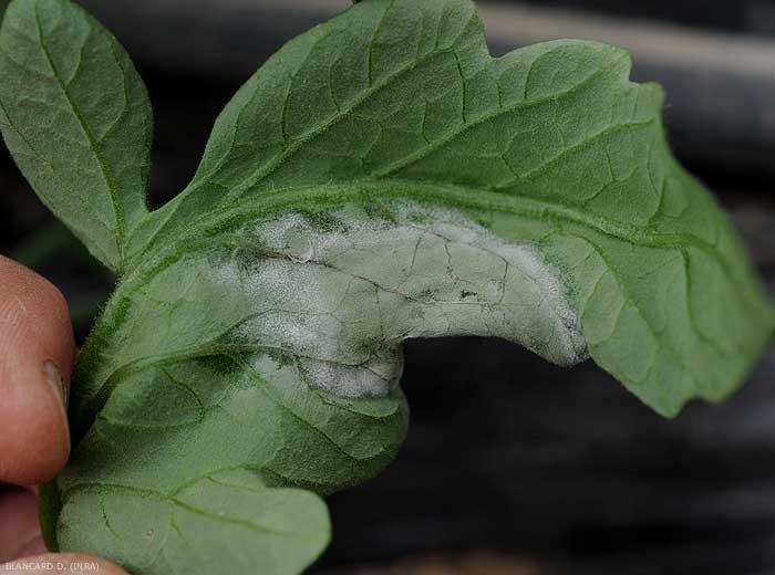 Les tissus de la tomate sont envahis par le mycélium de l’organisme responsable du mildiou de la tomate. Celui-ci y produit différents types de spores (structures assurant sa dissémination et sa conservation) qui peuvent hiverner dans le sol d’une année sur l’autre, et être à l’origine des contaminations primaires du début de saison. Notons qu'il sporule abondamment à la face inférieure des  folioles (figures 1 et 2), produidant de nombreux sporanges assurant les contaminations.