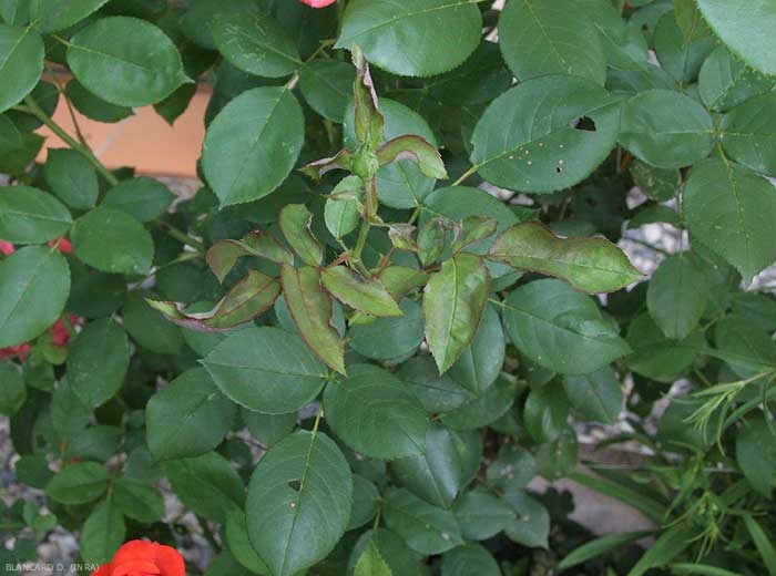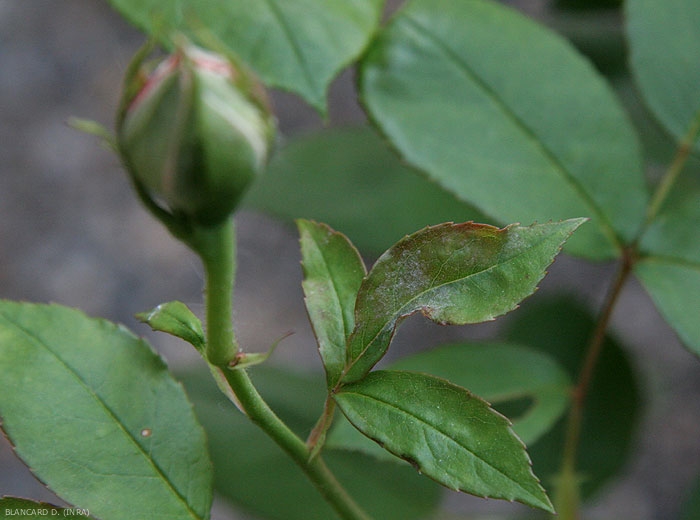 Le champignon apprécie les tissus jeunes et produit un feutrage blanc sur les différents organes aériens du rosier. Les jeunes pousses et les feuilles (figures 1 et 2) se couvrent de taches poudreuses blanchâtres, ce qui peut entrainer une déformation importante du limbe (figures 3 et 4). L'ôïdium provoque également le dessèchement des boutons floraux envahis (figure 5).