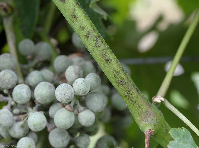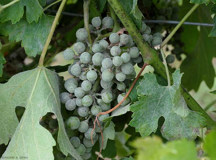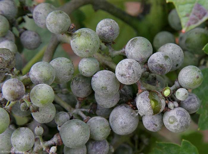 Les baies de raisin sont sensibles jeunes, avant la véraison. Les plus jeunes baies peuvent mourrir et tomber, alors que les plus développées sont plus ou moins couvertes du feutrage blanc (figure 4), deviennent superficiellement liégeuses et éclatent (figure 5). La croissance des baies est également affectée par le parasite, avec la production de petits grains.