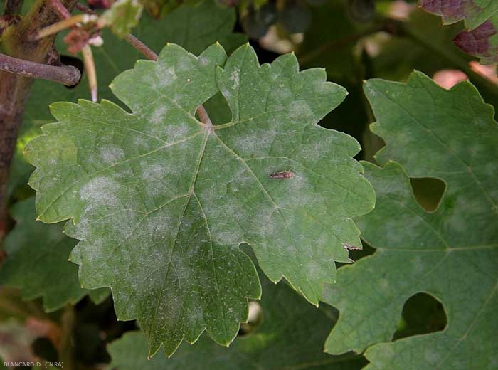 Sur les jeunes pousses, le développement superficiel de ce feutrage sur les feuilles entraine la formation de taches chlorotiques, le brunissement des tissus et la déformation du limbe. Sur les feuilles plus âgées, ce sont des taches poudreuses blanchâtres qui caractérisent cet oïdium (figures 1 et 2 ). Localement les tissus pasasités prennent une teinte jaunâtre avant de légèrement se nécroser. Soulignons que cette maladie peut se développer sur les deux faces du limbe.