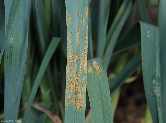 Les feuilles de poireau affectées présentent des petites lésions pustuleuses d'abord blanchâtres à beiges. Celles-ci s'étendent légèrement et donnent lieu à des pustules couleur orange vif à brun (figures 1 à 3), les feuilles se dessèchant à terme (figure 4).