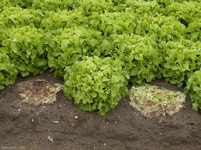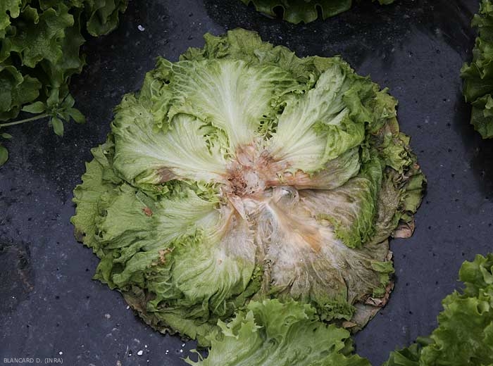 En fin de végétation, les plus extérieures puis l'ensemble des feuilles jaunissent et flétrissent brutalement (figure 1). Par la suite, les plantes fondent littéralement sous les effets d'une pourritures humide (figure 2).