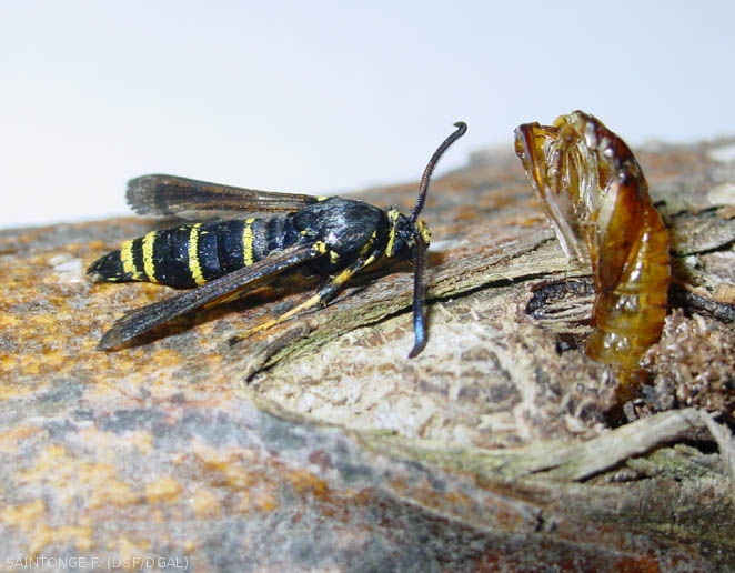 Avec la grande sésie (galerie plus large) au niveau des cépées et la petite saperde sur jeunes tiges ou rameaux.
