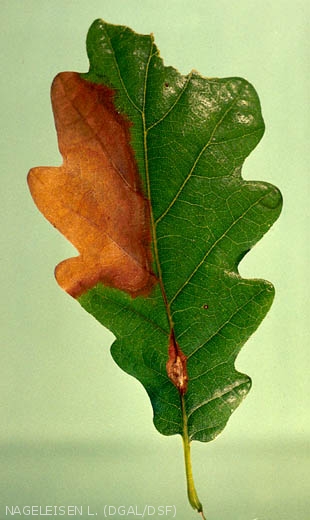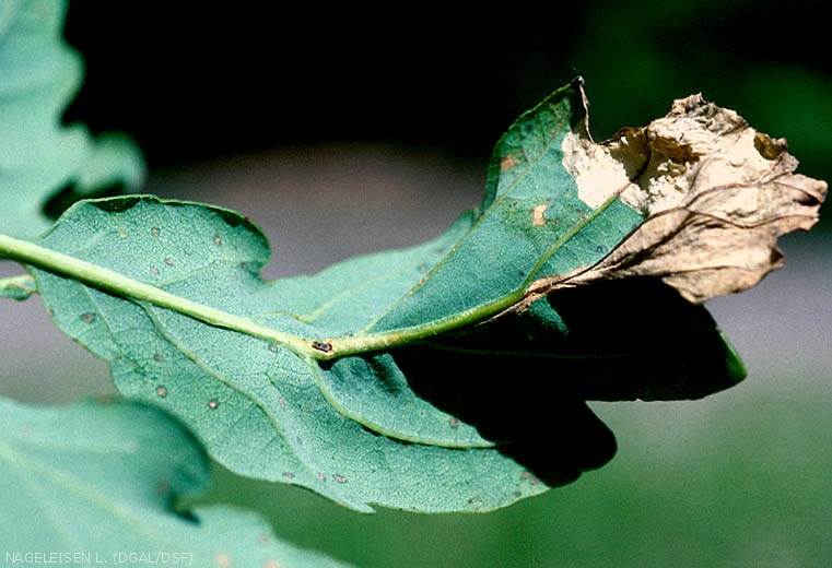 - Les galeries larvaires vont en s'élargissant en triangle vers le bord externe du limbe et donnent un aspect roux au feuillage
