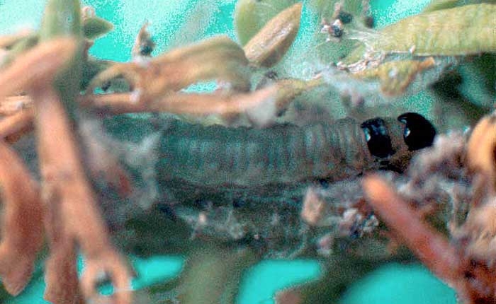Chenille verte à capsule céphalique noire, d'une vingtaine de mm en fin de développement