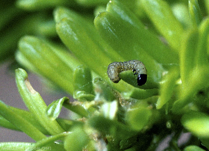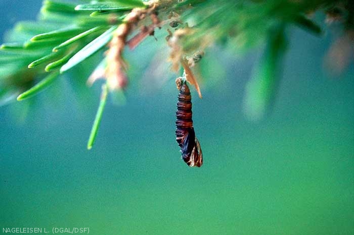 Les jeunes chenilles se développent en 10 à 15 jours. Dès leur apparition, elles cherchent refuge dans l'anfractuosité de l'écorce, où elles muent. Elles hivernent au deuxième stade larvaire sous les écailles des pousses (diapause). Au printemps suivant, les chenilles gagnent les bourgeons en développement, y pénètrent et commencent alors à s'alimenter. Parallèlement, elles tissent un fourreau lâche composé de plusieurs aiguilles qui leur sert de protection. En début de saison, les aiguilles sont attaquées dans leur partie médiane (perforations). A un stade larvaire plus avancé, l'attaque est généralisée sur l'aiguille, mais en respectant les bords qui sèchent et tombent. Chaque chenille détruit en moyenne 120 aiguilles, soit 1 à 2 pousses de mai. Ces dégâts se poursuivent environ pendant 8 semaines.