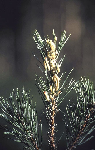 Les oeufs sont déposés en ligne par les femelles, dans des fentes pratiquées dans les aiguilles à l'aide de leur ovipositeur en dent de scie (d'où le nom de "mouche à scie", "saw fly" en anglais, qui leur est donné), et recouverts d'une substance brune. L'éclosion des fausses chenilles (larves) a lieu 3 à 4 semaines plus tard.
