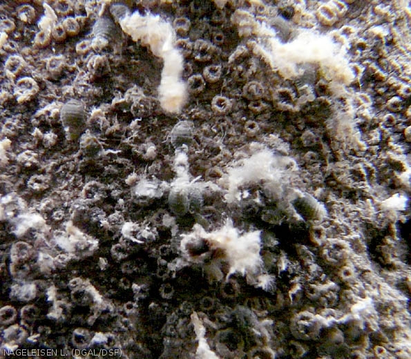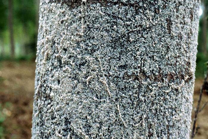 - Tronc recouvert d’un feutrage blanchâtre discontinu, constitué de traînées sinueuses suivant les irrégularités de l’écorce