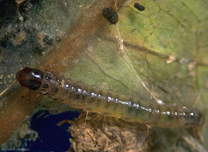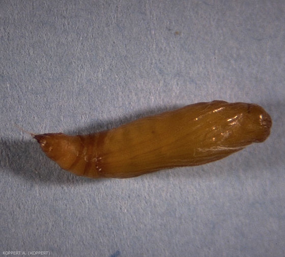 Nymphe : cocon de soie recouvert de terre et de débris végétaux, difficilement visible dans la culture, ou cocon de soie dans un endroit abrité à proximité des plantes (figure 4).