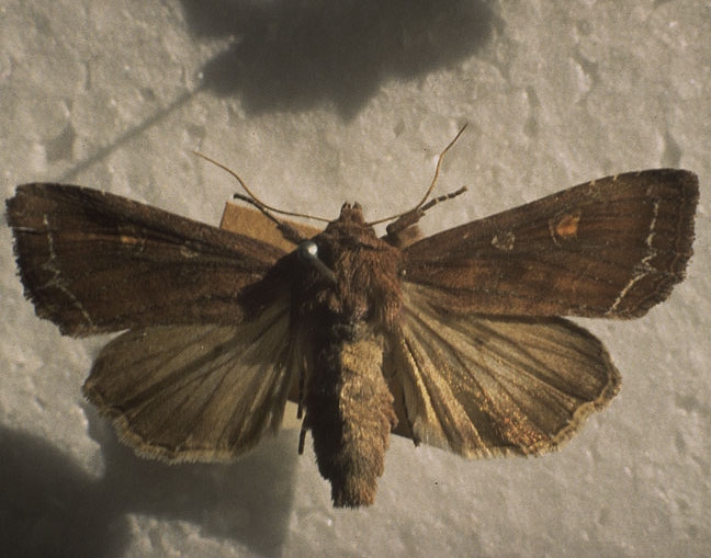 Adulte : envergure de 30 à 40 mm, ailes antérieures brun rougeâtre avec un dessin marron clair, réniforme, et une fine ligne blanche dentelée le long de la partie apicale. Comme chez la plupart des noctuelles, l’aile postérieure est grisâtre et plus claire que l’aile antérieure, avec une ombre plus sombre en bordure. Les antennes sont longues et fines, la tête et le thorax sont brun rougeâtre tandis que l’abdomen est brun gris plus clair (figures 1 et 2).