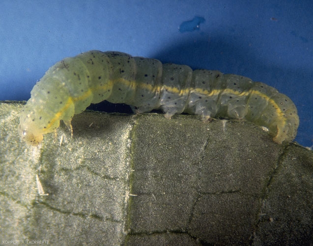 Chenille : possède quatre paires de pattes abdominales et peut mesurer jusqu’à 50 mm (figures 3 et 4). Ses deux premiers stades larvaires ont la tête vert pâle, puis blanche à marron-gris tacheté. Les dessins qu’elle porte varient selon la plante hôte et le stade de développement : au départ, le corps est vert brillant, puis une ligne jaune ornementée de points noirs apparaît, bien distincte de chaque côté du corps de l’insecte. Les chenilles plus âgées sont vert clair à marron clair ou parfois rougeâtres, avec, sur la face dorsale, trois rayures gris foncé partiellement atténuées par les traits gris-noir qui se trouvent en dessous. Une autre rayure grise longe le corps juste au-dessus des lignes latérales jaunes. Chaque segment possède plusieurs rayures plus foncées sur les côtés et sur le dos.
