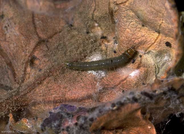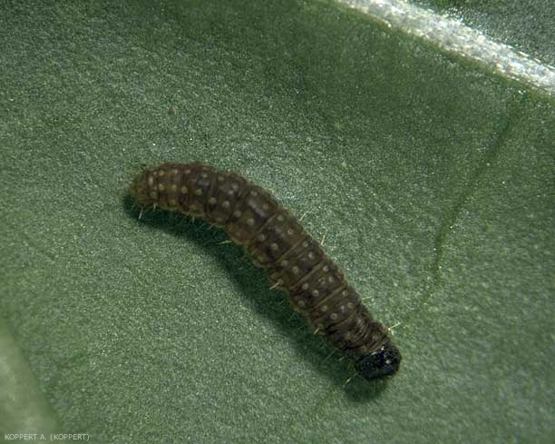 Chenille (figures 2 et 3) : tête vert foncé, voire noire, et un bouclier thoracique. Corps marron foncé, avec des lignes latérales parfois claires. Face ventrale plus claire que celle dorsale, avec des poils localisés sur des taches verruqueuses plus claires que la couleur générale du corps (figures 2 et 3). En général, les chenilles ont une apparence plutôt terne. Elles sont relativement fines (jusqu’à 25 mm de long), peu poilues et ont quatre paires de pattes abdominales. Elles sécrètent également des toiles dans lesquelles elles se cachent. Ce sont ces toiles qui provoquent l’enroulement des feuilles. Dans les cultures, on en observe beaucoup qui sont vides, ce qui amène à penser que les chenilles fabriquent probablement une série de toiles durant leur développement. Elles peuvent aussi vivre dans les fleurs ou les fruits. Lorsqu’elles sont dérangées, elles s’enroulent sur elles-mêmes et se suspendent au bout d’un fil de soie.