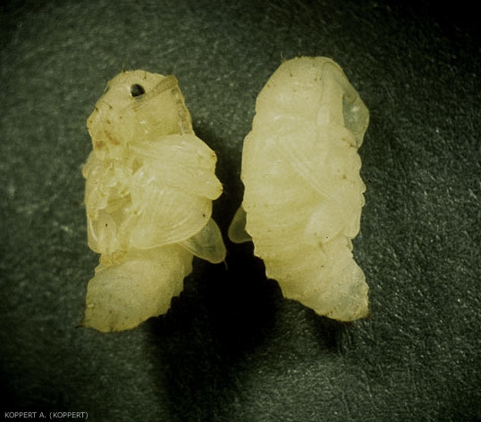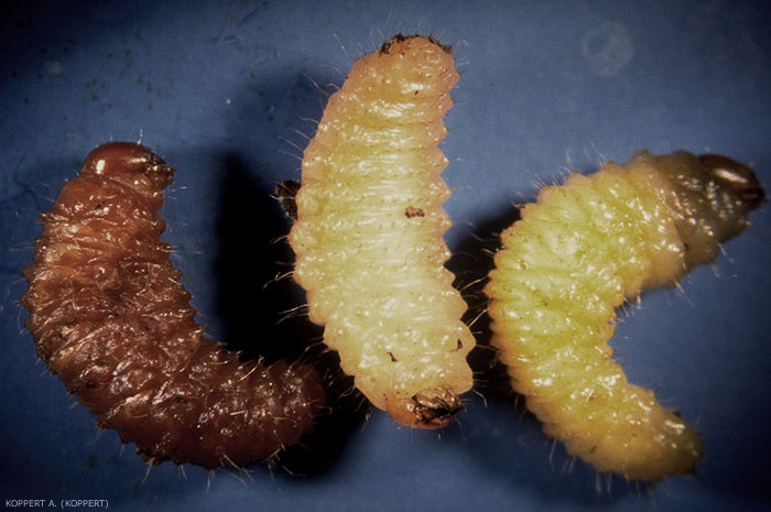 Larve : blanche, apode, corps fortement incurvé et grosse tête brune (figures 2 et 3). Elle s'enroule en forme de C lorsqu'elle est dérangée.