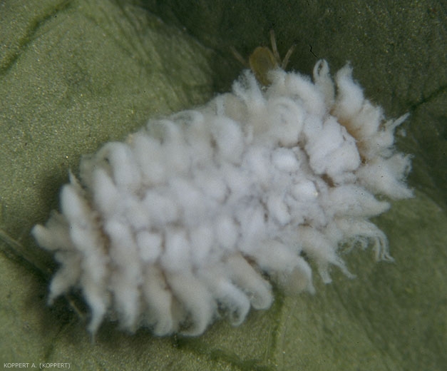Larves (figure 1) : Pendant les premières 24 heures, elles restent dans le groupe d'oeufs ou à proximité. Elles consomment d'abord la coquille de leur oeuf vide, et bien souvent d'autres oeufs non éclos. Elles se reconnaissent facilement car elles sont blanches, duvetées, avec des sécrétion cireuses, et mesurent jusqu'à 1,3mm. Elles possèdent un appareil suceur spécialisé qui leur permet de ne pas tomber des feuilles.