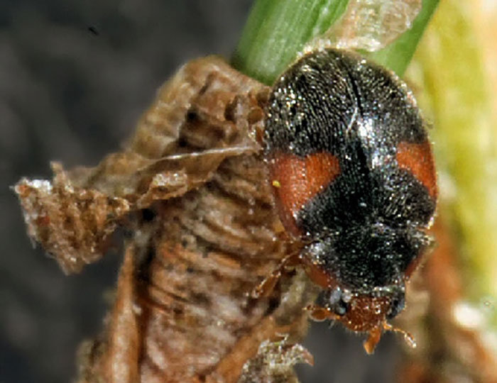 Adulte : coccinelle (figures 2, 3 et 4) , émerge de la nymphe, est de couleur marron foncé, et mesure 1.8 à 2.3mm.