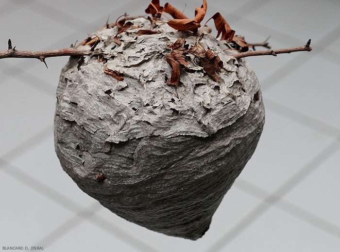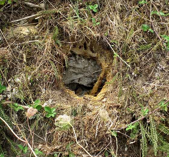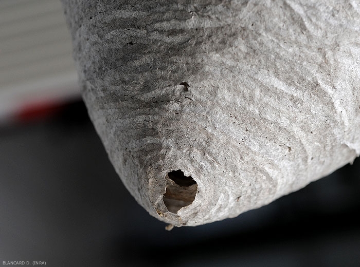 Comme les frelons, les guêpes fondatrices commencent à bâtir des nids au printemps avec le retour de températures plus douces. Ceux des guêpes du genre Vespula sont souterrains (figure 4) et aériens (figures 5 et 6). Ils sont réalisés en papier mâché et peuvent être confondus avec ceux du frelon asiatique, mais leur entrée est toujours située sous le nid (figure 7).