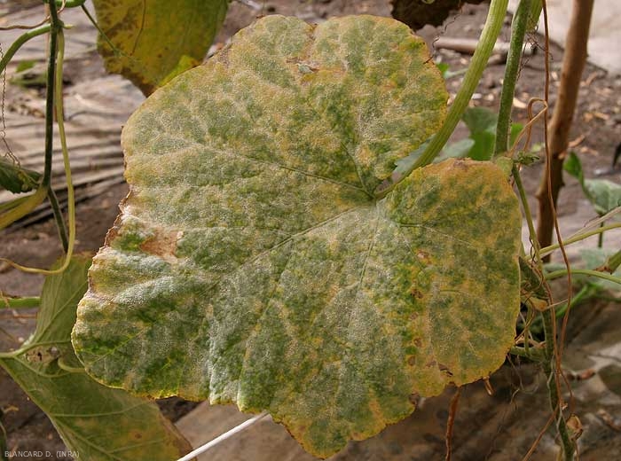 Les champignons attaquent surtout les feuilles, du début de l’été au début de l’automne. Des taches blanches et poudreuses s’étendent jusqu’à recouvrir toute la surface des feuilles (figures 1 à 3), sur les deux faces, en commençant par la face supérieure. Le limbe peut à terme jaunir plus ou moins (figure 4).