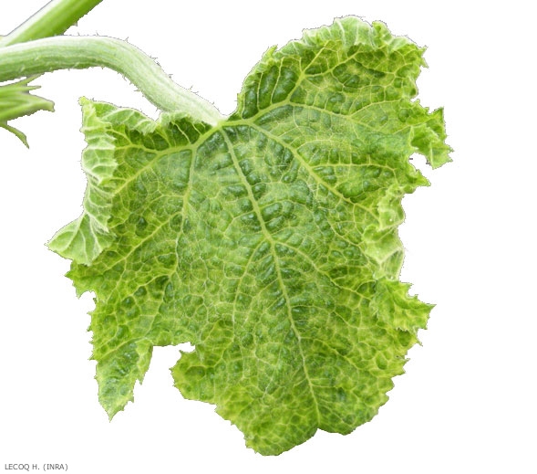 Les symptômes associés à cette virose se manifestent surtout sur les jeunes feuilles qui s’enroulent, se recroquevillent et restent de petite taille. Le limbe présente un jaunissement internervaire plus ou moins intense (figures 1 à 5). Les fruits peuvent aussi être affectés, montrant un gaufrage de l’épiderme s’intensifiant au fur et à mesure de leur croissance. La croissance des plantes peut être fortement ralentie, voire complètement bloquée.