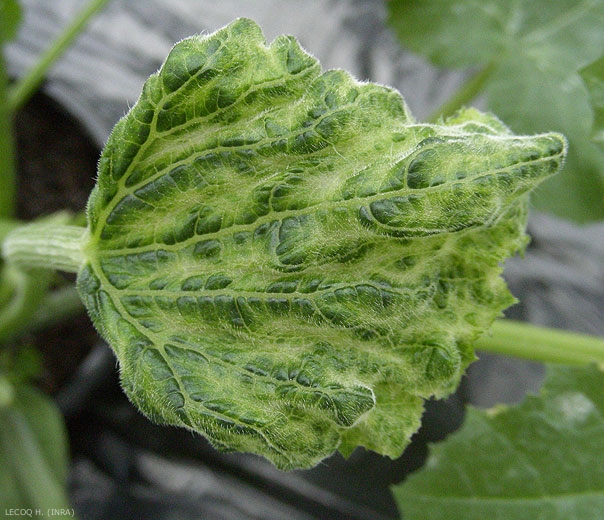 Notons que le ToLCNDV a été également isolé en Espagne à partir d’échantillons de concombre, de courge et de melon présentant les symptômes suivants : mosaïque jaune intense, enroulement et déformation des feuilles, et rabougrissement et perte de vigueur très prononcée des plantes.
