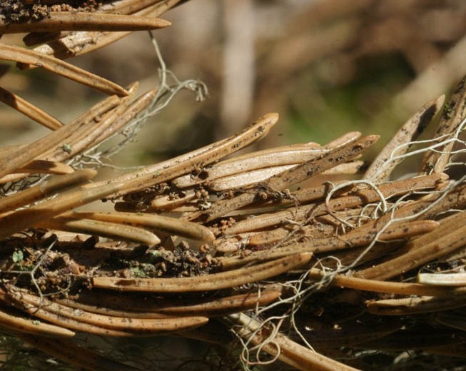 - Sur les rameaux, les aiguilles roussissent par paquets de plusieurs aiguilles aglomérées par des tissages soyeux, remplis de déjections