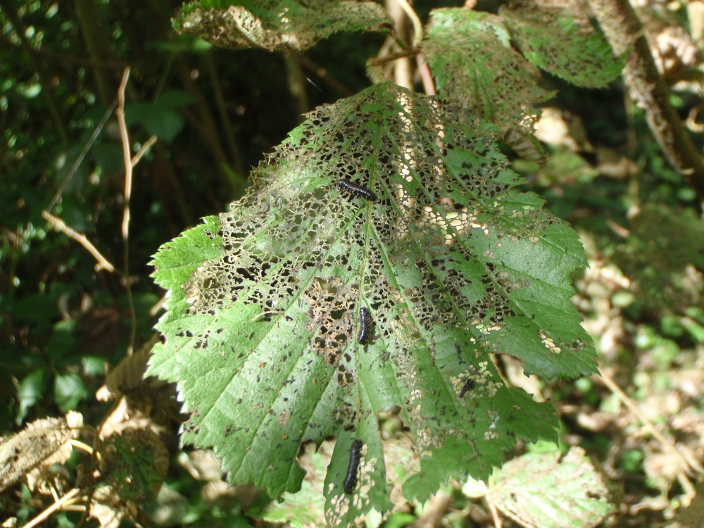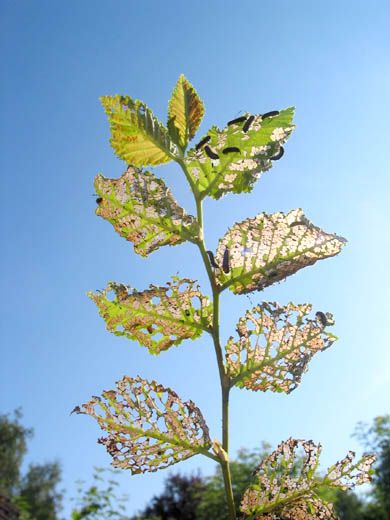 Les feuilles sont d'abord décapées par les larves laissant le "squelette" cellulaire apparent. Elles jaunissent puis brunissent en cours de saison au fur et à mesure de la consommation. Les adultes perforent les feuilles en s'alimentant.