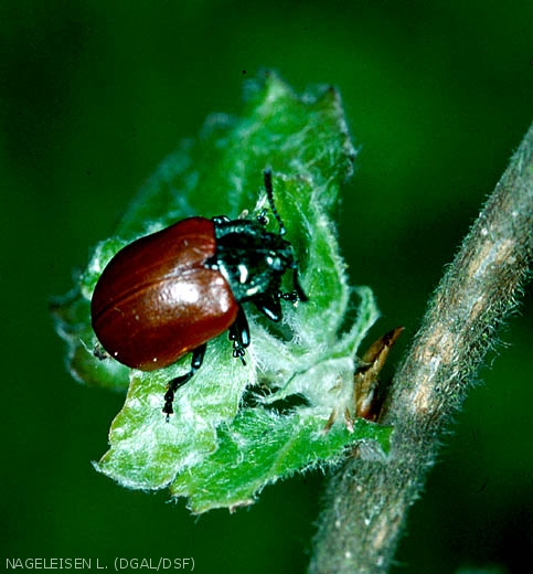 Le décapage de feuilles par les larves aboutit à un aspect parcheminé (nervures respectées). Le grignotage par les adultes provoque une criblure des feuilles (petites perforations).
