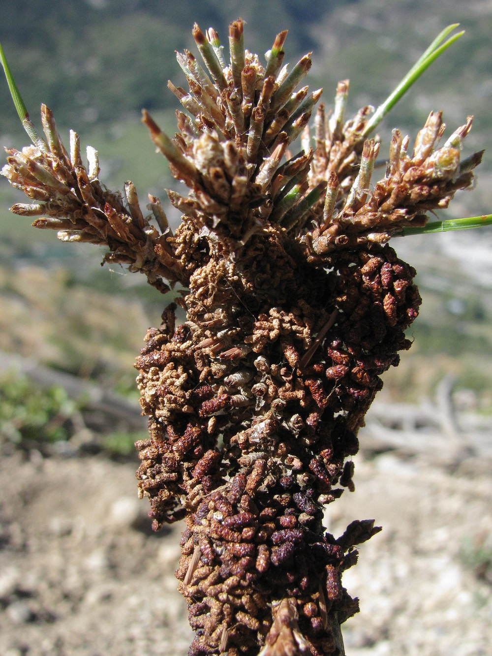 - Défoliation des pousses terminales avec présence systématique d'un fourreau rempli des déjections de la larve