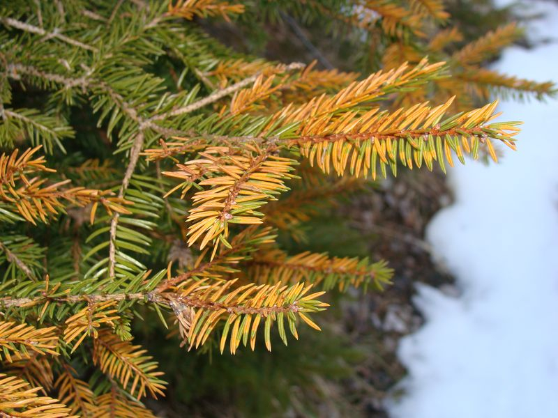 - sur les aiguilles de l'année, on observe des zones annulaires bigarrées, jaunes orangées. Le reste de l'aiguille est verte et présente un aspect sain.