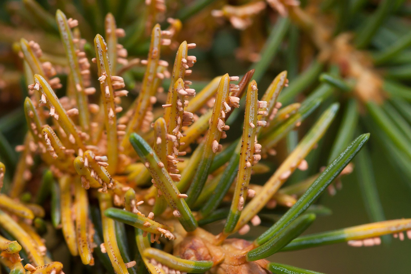 Les colorations jaunâtres sont occasionnées par le développement du mycélium du champignon dans les tissus de l'aiguille. A l'automne, des vésicules allongées, dans lesquelles se développent des téliospores, apparaissent sur la face inférieure. Au printemps, les basidiospores sont libérées et vont infecter des aiguilles nouvellement formées.