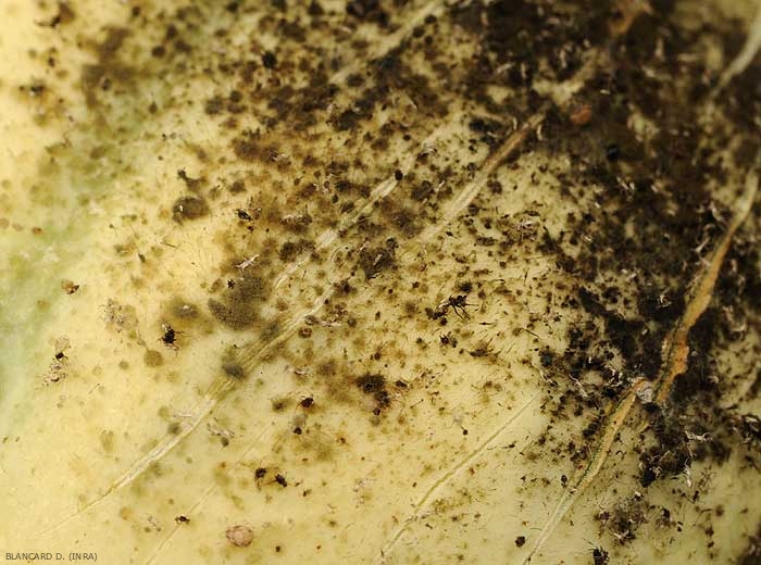 • Description : constituées d'une multitude de conidiophores  dressés  se développant à partir de filaments cloisonnés présents à la surface du tissus des différents organes aériens des légumes. Ces conidiophores  portent diverses conidies en chaînes ou non. Notez que le mycélium, les conidiophores, et les conidies ont souvent tendance à mélaniser, autrement dit à prendre une teinte brune à noire. La fumagine  (sooty mold) est caractériser par le développement d'une à plusieurs moisissures très superficielles et parfois étendues, de teinte noirâtre bien souvent. Elle est associée au développement de plusieurs insectes phytophages, en particulier les pucerons, les aleurodes, les cochenilles qui produisent un miellat sucré, une véritable aubaine pour plusieurs champignons saprophytes du phylloplan.