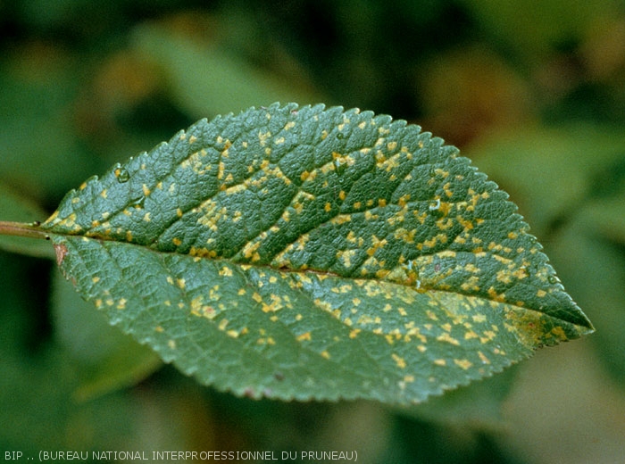 En cours de végétation, on voit apparaître à la face supérieure des feuilles, des taches angulaires décolorées jaune-orangé réparties au hasard sur le limbe (figures 1 à 4). Elles peuvent apparaître le long des nervures, en bordure du limbe ou de manière diffuse sur l'ensemble de la feuille.
