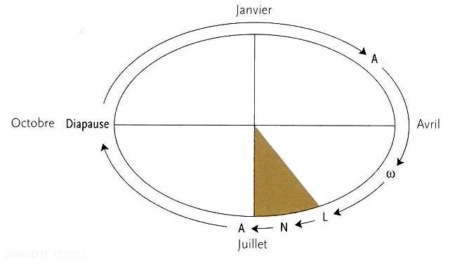 La larve est blanche à tête brune (figure 2). Elle est apode, recourbée et trapue. Elle est présente aux extrémités des galeries maternelles (il n’y a pas de galeries larvaires). On observe une génération par an.